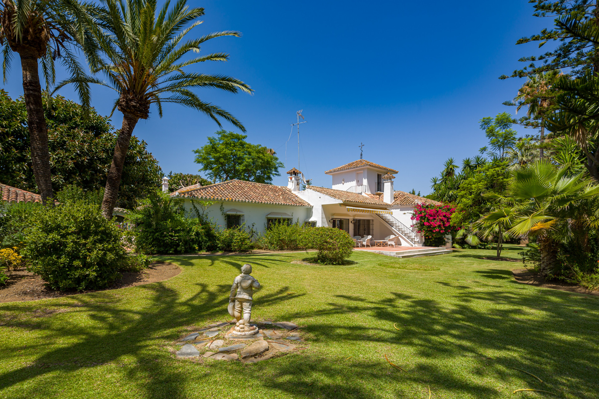 Beautiful villa built in the early sixties on a large flat plot located on the beachside of San Pedro de Alcántara in the residential area of Guadalmina, only a walk away from the beach club with restaurant and tennis courts. This 1 level villa with refurbished studio tower room is set amidst fabulous gardens offering a wide variety of mature trees, a swimming pool area with summer dining and barbecue corner as well as a guest cottage with bedroom, bathroom and living room. The main villa offers an entrance corridor, 4 bedrooms with en suite bathrooms, living room with fireplace, dining room, fully fitted kitchen, patio terrace with fountain, utility room, small solarium terrace as well as a carport for 4 cars and plenty of parking space on the private drive. This property offers plenty of charm and development potential. The villa offers central gasoil heating with radiators, alarm system, satellite television, electric sun blind and is tiled in a combination of marble and laminated parquet. Further the property includes a gardener’s cottage as well as an own water well which reduces the irrigating cost substantially. Definitely one of the better plots in the area and an ideal and prestigious location for a great investment project. The urbanization offers 24 hour security from the community and is situated less than 5 minutes away from San Pedro de Alcántara and the prestigious Puerto Banús.